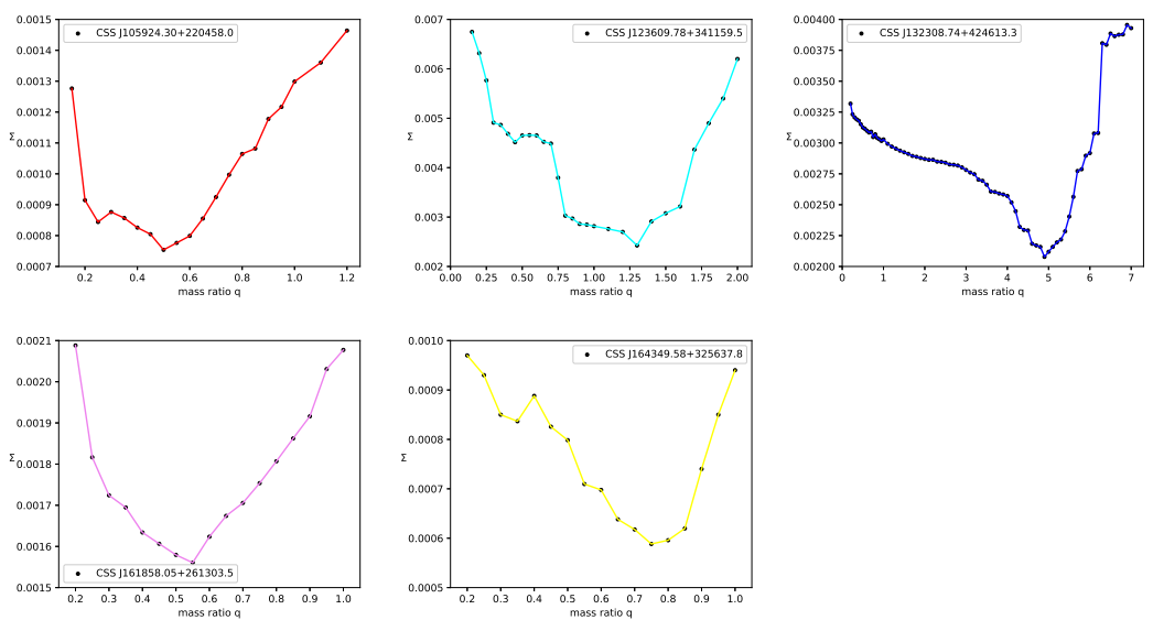 The well-known q-search method was used to find the best initial mass ratio value fixed at each iteration and increased by 0.05 from q = 0.05 to 1 and by 0.1 beyond q = 1, since the mean residual showed a minimum.