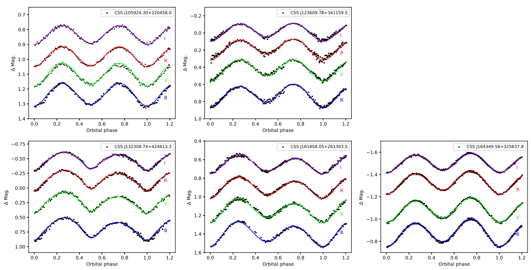 Except for J123609, the other four systems possess the typical characteristics of the low mass contact binaries (LMCBs) as proposed by [Stepién & Gazeas(2012)], that is, systems where the total mass is under 1.0 - 1.2M