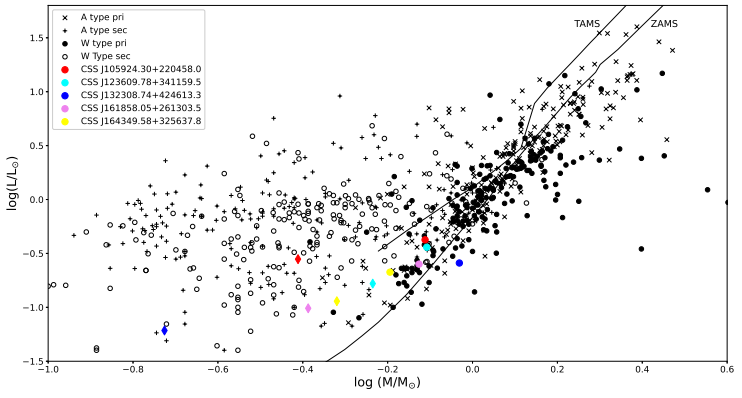 In Figure 4, we plotted the primary, more massive (circles) and secondary, less massive (diamonds) components together with other W- and A-type W UMa systems collected by [Latkovic et al.(2021)] in the logarithmic mass-luminosity (M - L) relations along with the ZAMS and TAMS computed by [Girardi et al.(2000)].
