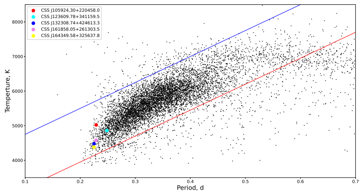 Finally, following the work of [Qian et al.(2020)], who investigated the period-temperature relation of contact binary systems using the LAMOST stellar atmospheric parameters, and constructed the heat map for this relation as shown in our Figure 6, we can see that our systems are located inside the red and blue lines that are the boundaries of the normal EW systems.