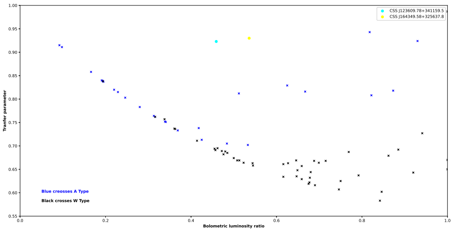 Figure 7 shows that, except for the system which has q > 0.72, our systems have a good correlation between the bolometric luminosity ratio and the transfer parameter.