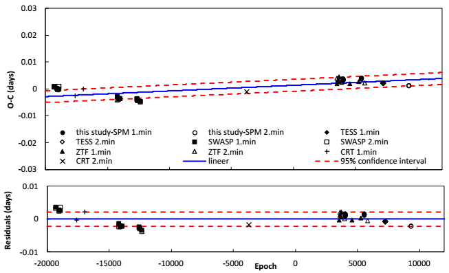 Fig. 1 According to all primary and secondary minimum times, the (O-C) diagram of the short period V840 Lyr binary. The blue solid line depicts a linear fit. In the lower panel, residuals pertaining to the linear ephemerides are shown. The red dashed lines represent a 95% confidence interval. The color figure can be viewed online.