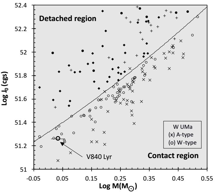 Fig. 10 The location of V840 Lyr on the mass-angular momentum diagram according to Eker et al.(2006), under the