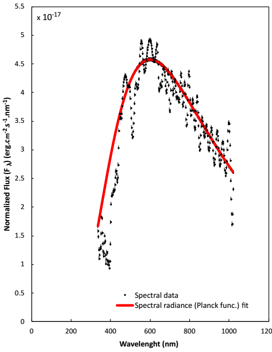 Fig. 2 The Gaia energy distribution spectrum of the V840 Lyr binary star system. The black dots along with the errors show the spectral data of the system. The red solid line depicts a black-body (Planck function) fit. The color figure can be viewed online.