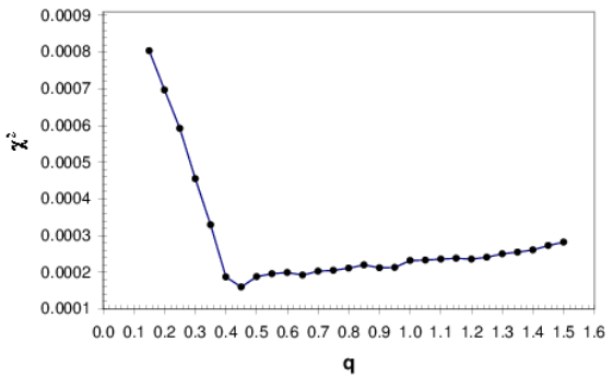 ). For a variety of mass ratio values, solutions were obtained. We discovered that the answers typically converged to mode 3 for each value of q. The calculation began in mode 2 (detached mode) for each value of q. Figure 3 shows the relationship between q and the sum of the results of the weighted squared deviations,
