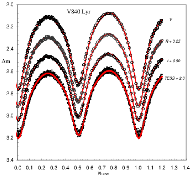 light curves described above are used. The W-D code-based & Phoebe0.31a interface program was used to analyze the light curves of V840 Lyr in order to understand its geometrical structure and evolutionary state Wilson & Devinney(1971), Wilson(1979), van Hamme & Wilson(2003), Wilson et al.(2010), van Hamme(1993). The O’Connell effect can be seen in the binary system’s light curves, and it can be explained by dark-cool spot activity on the secondary component Qian et al.(2017). The O’Connell effect can be modeled by placing a spot on any of the system components. At the same time, the study of Kallrath & Milone(1999) explains how to determine the hotter and cooler spot. As specified by Kallrath & Milone(1999), ‘colour amplitudes increase when going to