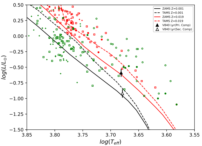 Fig. 7 The locations of V840 Lyr along the ZAMS and TAMS lines from Girardi et al.(2000) (Z = 0.001 and 0.0019) on the HR diagram. The black-filled and empty triangles display V840 Lyr’s primary and secondary stars. The example systems of Yakut & Eggleton(2005) are presented. ’