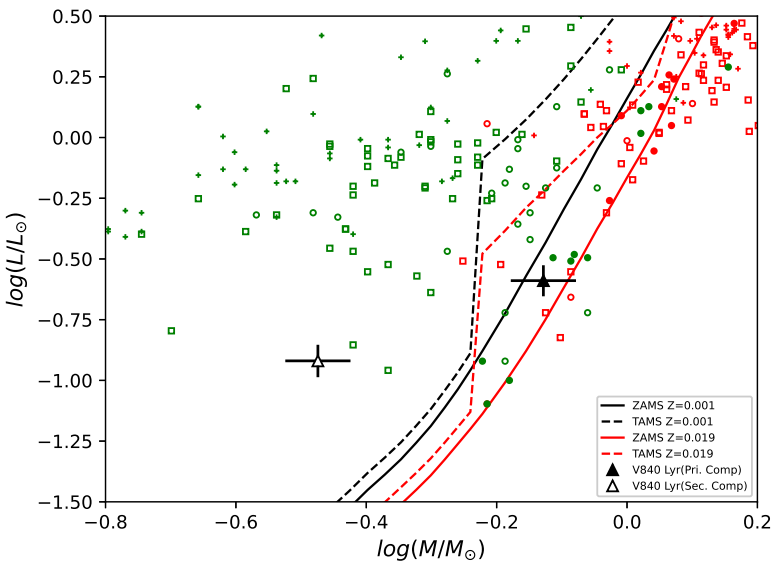 Fig. 8 V840 Lyr’s location on the mass-luminosity diagram. The sample systems, symbols, and other details are indicated in Figure 3. The color figure can be viewed online.