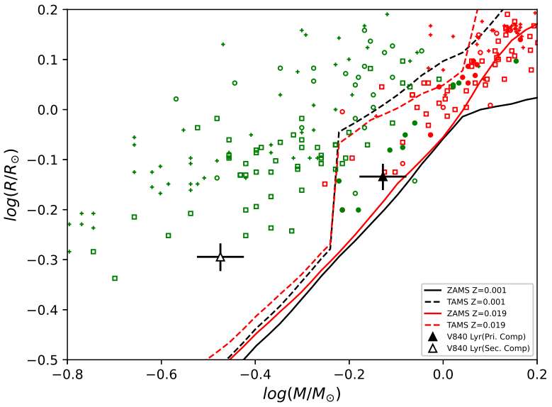 Fig. 9 V840 Lyr location on the mass-radius diagram. The sample systems, symbols, and other details are indicated in Figure 3. The color figure can be viewed online.