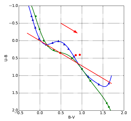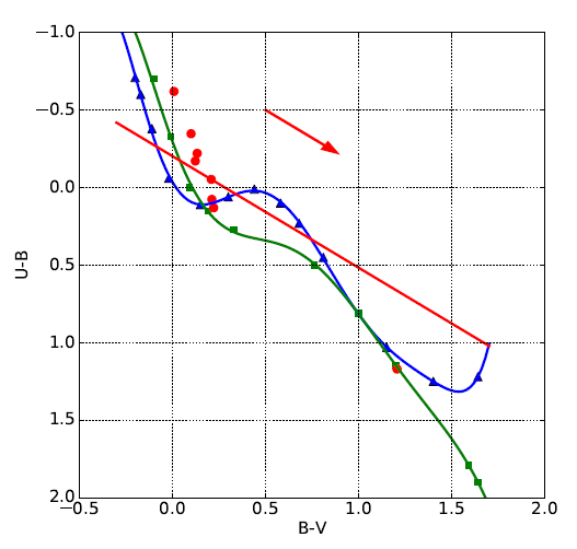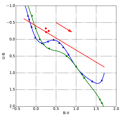 Using the colour values, we may determine the Q index (see Johnson & Morgan (1953)), which we know is reddening independent:
