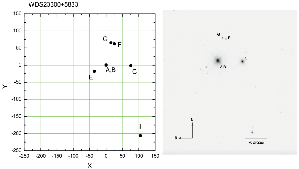 Trapezium ADS 16795 (also known as WDS 23300+5833) is located at RA=23h 30m, Dec=+58° 32 and has six components: AB, C, E, F, G and I, whose location is shown in Figure 11.