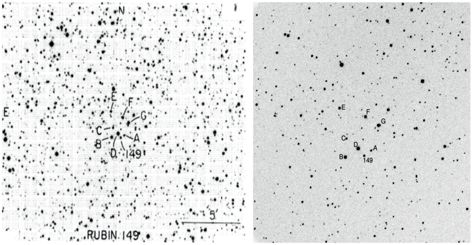 The standard stars are used in general to calibrate other astronomical observations. In this work, we shall refer to the set of equatorial standard stars published by [Landolt(1992)]. We observed several of the Landolt standard regions every night and used them to calibrate our observations of the trapezia stars. Figure 2 shows a comparison of the standard region Rubin 149 observed by [Landolt(1992)] and by us.