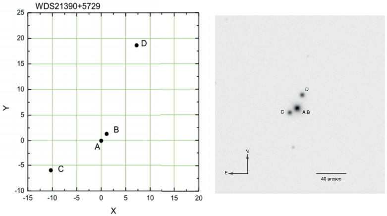 The trapezium ADS 15184 (also known as WDS 21390+5729) is located at RA=21h 38m, Dec=+57° 29. It has four bright components denoted as A, B, C, and D. Their distribution is presented on the left of Figure 4. The right panel of this figure shows our image for ADS 15184 in the V filter. On the figure we have identified the components A, B, C and D. The A and B components are very bright and even on the short time exposure appear melded as shown in Figure 5. Due to this fact, the photometry of both these objects is carried out as if they represented one star only, which we denote as the AB component.