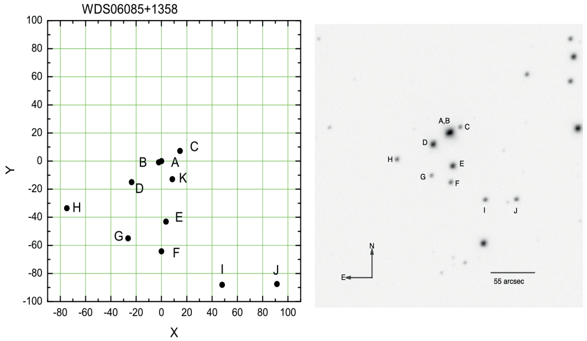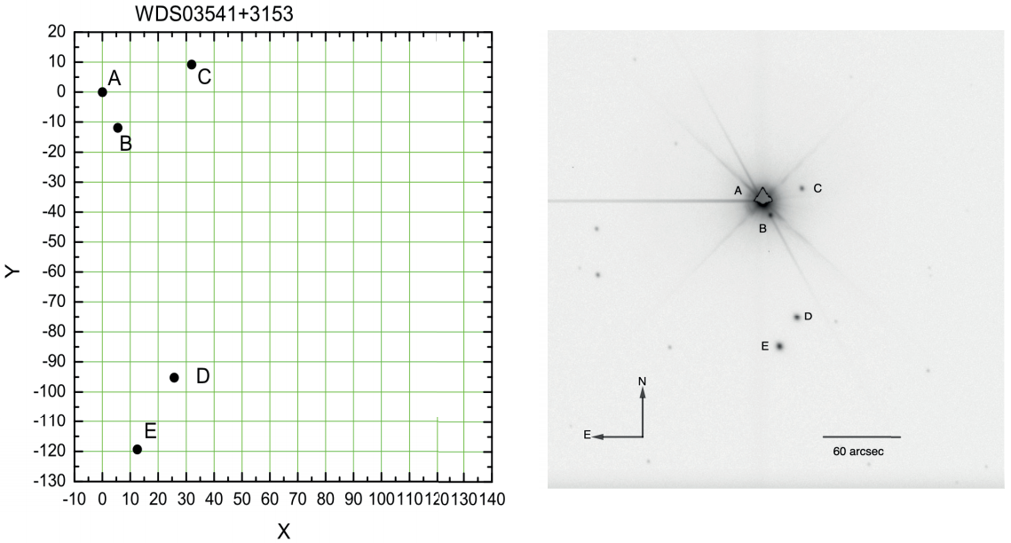 Fig. 11 The left image represents the components of the trapezium ADS 16795. The axes units are arcseconds. On the right, we show our observed image in the V filter, with N-E orientation and scale in arcsec. Exposure time is 5 seconds.