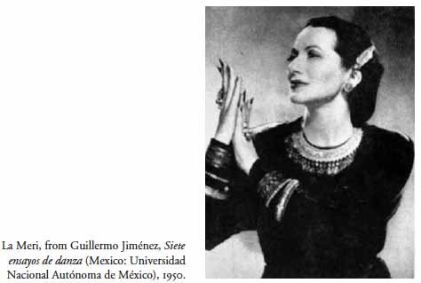La Meri's professional career began in the 1920's and from that decade through 1939, she toured many parts of the world. Her first foreign engagement was a three-month visit to Mexico City where she performed and also took lessons in Spanish dance, Mexican regional dance, and movements of the torero. In her autobiography, she writes that she learned the jarabe tapatío from Pedro Valdez and performed it with him. She identifies Valdez as "Mexico's finest native dancer, who had taught Pavlova and helped her with the staging of her well-known Mexican Dancesballet".19 At this early stage of her career and development, she did not know enough to distinguish between traditional folk or social dances and their theatricalized versions. Such understanding would only come later. In addition to beginning in Mexico what would become a habitual quest for learning new dance vocabularies and choreographies in the countries she visited, she also acquired her professional name thanks to a journalist who dubbed her "La Meri".20