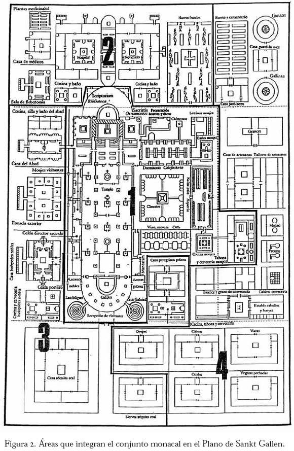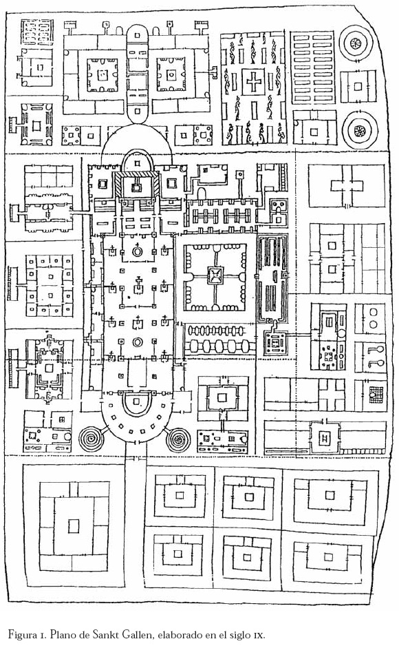 The Sankt Gallen Map, a document dating from the IX century of Charlemagne, is examined in line with findings and subsequent considerations following the publication of a study by Walter Horn and Ernest Born. The data obtained from recent research is used to reflect on the fact that the document actually represents a series of differing functions rather than serving as a traditional map. Emphasis is placed on the need to conduct a painstaking review of the cultural circumstances surrounding the map's creation, since changes derived from the monastic reform proposed by Benito de Anguiano presupposed a formal transformation of monasteries to adapt to emerging needs. Similarly, within the overall context of evangelizing activities performed by mendicant orders in the New World, this work highlights the association between the opening of Benedictine temples to laymen and the delayed adoption of architectural solutions in New Spain in the first half of the XVI century; such solutions were abandoned in Europe two hundred years earlier.