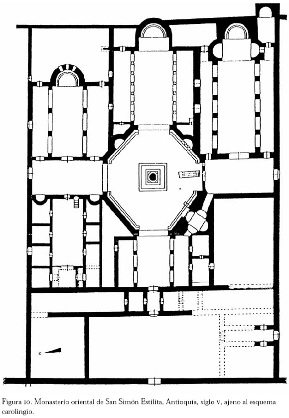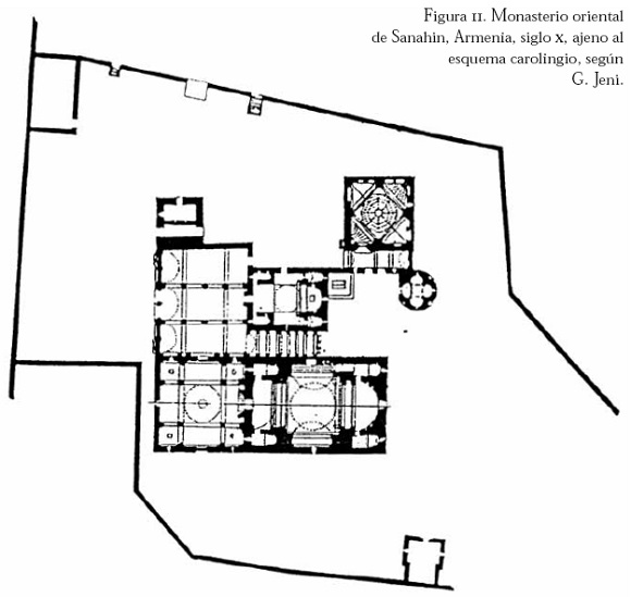 Ya vimos que, en los pocos datos conocidos sobre monasterios germanos carolingios, aparecen las naves adoptando la forma cuadrada y sin claustro adosado lateralmente. Estas características coinciden con las soluciones orientales de monasterios conocidos como el monasterio de San Simón Estilita, en Antioquía (siglo V), el monasterio armenio de Sanahin (siglo X), y el monasterio armenio de Haghbat (siglo XII) (figuras 10, 11 y 12). Pero también existe otra semejanza importante, pues en unos y otros casos los orientales y los carolingios los conjuntos monacales están formados por edificios aislados que se acomodan convenientemente para formar grupos, dejando patios y espacios distributivos en las áreas intermedias.