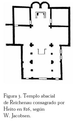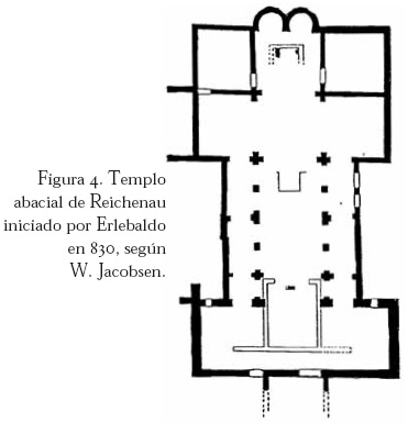 El mismo investigador ha mostrado, con el apoyo de datos arqueológicos, que la iglesia de Heito, consagrada en 816, en Reichenau (figura 3), tenía tres naves que unidas no llegaban a la proporción de un cuadrado y que en la ampliación del abad Erlebaldo, iniciada en 830 (figura 4), se añadió un transepto occidental, con un pequeño aumento a las naves que les dio la proporción cuadrada.