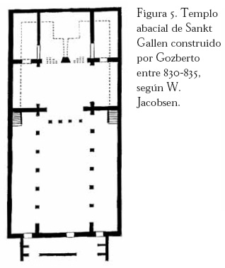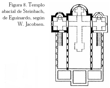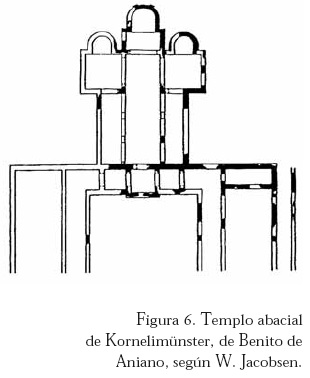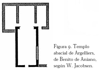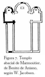 Para completar sus observaciones, Jacobsen, también con apoyo arqueológico, ha mostrado que el templo abacial construido por Gozberto entre 830 y 835 (figura 5) tiene el conjunto de naves apenas mayor que un cuadrado y su ábside, único, no es semicircular. Por otro lado, iglesias abaciales ligadas a la influencia de san Benito de Aniano tienen la clara tendencia al alargamiento de las naves, transepto oriental y ábside semicircular con absidiolas de la misma forma rematando las naves laterales. Tal es el caso de Kornelimünster (815-817), Marmoutier (814-815?), Steinbach (815-817) y aunque sin ábside ni absidiolas Argelliers (780-799) (figuras 6 , 7, 8 y 9). En todos estos casos no hay claustro adosado lateralmente.