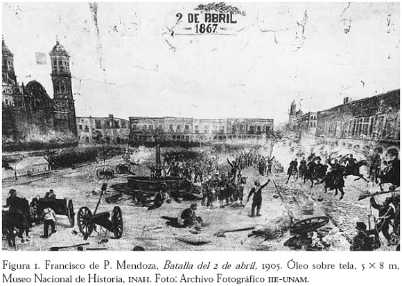21. Una placa, en el Museo del Ejército, indica que esta pintura representa la batalla del 2 de abril de 1867, pero es evidente que se trata del 5 de mayo de 1862, por varias razones, aunque bastaría una para corroborarlo: la del 2 de abril se libró dentro de la ciudad, calle por calle y barricada por barricada, como la pintaron Prieto y el mismo Mendoza en 1904.