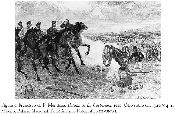 En la Batalla de La Carbonera, terminada en 1910 con la pretensión de reverdecer otro de los laureles de Díaz, ya ni siquiera podemos hablar de que haya una batalla. Esta victoria fue obtenida por Porfirio el 18 de octubre de 1867, muy pocos días después de que ganara la de Miahuatlán. Mendoza, cuando recibió el encargo de pintarla, optó por seguir el parte oficial rendido por el mismo Díaz, en su calidad de jefe del Ejército de Oriente: "Nuestra artillería, colocada sobre el cerro de La Carbonera, respondió a ese tiro y se empeñó el fuego por ambas partes."22