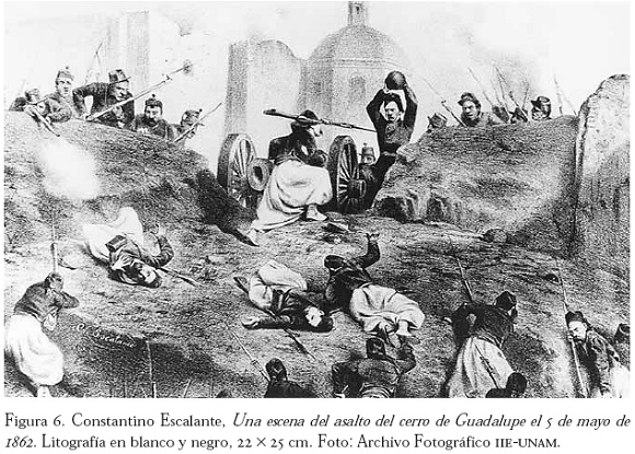 La primera litografía ilustra un momento del asalto al fuerte de Guadalupe, el 5 de mayo de 1862. El artista escogió el instante más dramático de la batalla, el punto en que culminaba el esfuerzo francés en las troneras mismas de la fortificación. Dos veces el ejército invasor había intentado, temerariamente, alcanzar el muro defensivo del fuerte, y las dos veces fue barrido por la artillería mexicana, situada en excelente posición de tiro. El tercer intento, con más brío, venció la pendiente y alcanzó la muralla. Por un momento, parte de las tropas mexicanas se replegaron hasta la capilla, creyendo perdido el recinto; pero el resto resistió codo con codo con los servidores de la artillería. Es un último instante, captado por Escalante, en que toda la suerte de la batalla depende de un postrer impulso para romper ese terrible equilibrio entre atacantes y defensores. Los zuavos han entrado en el cuerpo a cuerpo sobre las almenas mismas, pero los tres cuerpos caídos insinúan ya el fracaso. El cuarto, que ha quedado solo y lucha a la bayoneta, constituye un caballeroso testimonio de la bizarría del ejército francés, reconocido por los mismos mexicanos.