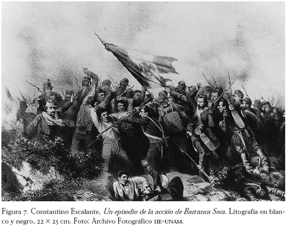 La misma concentración consiguió en la acción de Barranca Seca, batalla sostenida el 18 de mayo de 1862 en el camino a Orizaba, durante el repliegue de los derrotados cuerpos franceses. Nuevamente, de toda la batalla, Escalante dibujó sólo un grupo o un núcleo que puede tomarse como un símbolo. Un puñado de hombres, constitucionalistas y conservadores, se enfrascan en una lucha cuerpo a cuerpo que hace inútiles las armas de fuego. Es una lucha encarnizada en la que se disputan la posesión de una bandera que varias veces ha cambiado de manos. Los cuerpos de los caídos y los heridos empiezan a formar un montículo cuya cima es la bandera, muy desgarrada, y las manos crispadas que la pelean. Esa forma de monte o pirámide que da a su litografía permite a Escalante comprimir y condensar fuerzas y toda la desesperación de las tropas. Así es como un artista de talento puede sintetizar en una forma sencilla toda la violencia desatada en la guerra.