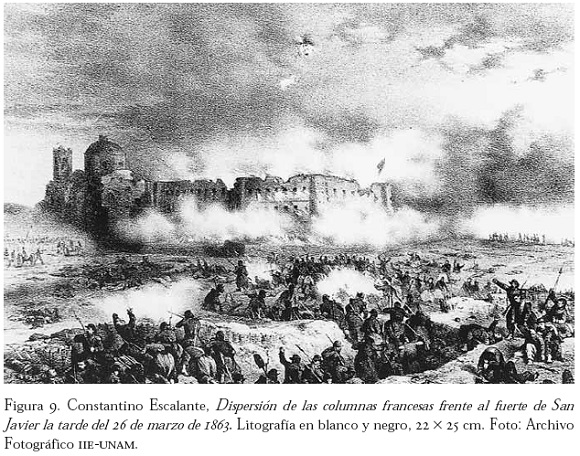 La cuarta litografía es Dispersión de las columnas francesas frente al fuerte de San Javier en Puebla. Si no conociera la procedencia, yo pensaría que contemplo una ilustración sobre la epopeya de Sabastopol en la guerra de Crimea (1854). Tales son la fuerza expresiva y la emotividad conseguidas por el artista. La acción sucedió el 17 de mayo de 1863, cuando finalmente la ciudad de Puebla fue conquistada. Los soldados franceses, experimentados y disciplinados, protegiéndose en las trincheras, avanzan sus paralelas para alcanzar la aproximación necesaria hasta la línea de la que habían de surgir para el supremo asalto. La fortaleza mexicana recibe los impactos de la artillería de Forey y responde al duelo. El nerviosismo del ejército francés contagia al espectador. El cielo tenebroso, la silueta del edificio semidestruido y el compás de espera de los franceses aguardando la orden de sus comandantes expresan mejor que los partes oficiales la tensión de la batalla. Cuánta acción y cuánta angustia contenidas en unos cuantos centímetros cuadrados de papel. Jean Adolphe Beauce, pintor que vino en la expedición francesa, llevó al óleo la misma escena contemplada bajo el mismo ángulo visual de Escalante. Beauce era pintor de batallas y casi pintor de corte, de notoria formación académica. ¡Pero qué contraste entre esta obra suya y la litografía de Escalante! Aquélla es una escena cuidadosamente estudiada, tranquila y descriptiva. La de Escalante es el patetismo, el hito histórico y la vivencia de la guerra.