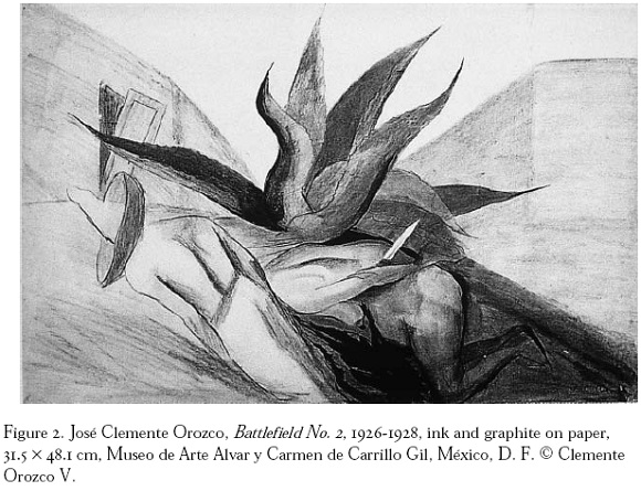 Among the drawings that most graphically display corporeal devastation are Mutilated and The Wounded, images of temporary field hospitals filled with disfigured and amputated soldiers. Piles of dead bodies abound in several other drawings. Battlefield No. 1 and Battlefield No. 2 each show two bodies at the bottom of a hill crowned by the image of a torn, ripped maguey plant. The bodies are so flat, they seem to be eviscerated of skeleton and bone, appearing as lumps of flesh lining the hill. Each drawing includes the form of a hat that sits in volumetric repose to the formless bodies.