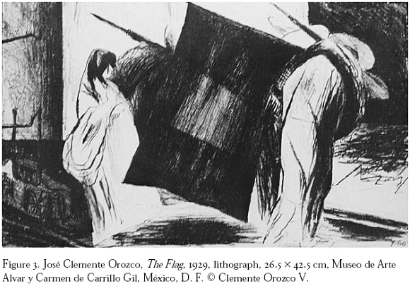 The Flag was the first of the Horrores series to be turned into a print. The lithographic version of the drawing departs from the drawn original in several significant ways. Orozco cropped the somber image of dejected soldiers and soldaderas walking across train tracks with bowed heads while carrying a large flag, to eliminate the prone figure splayed across the railroad tracks in the lower left foreground of the composition. The lithograph focuses instead on the group of walking figures, which was skewed slightly to the right of the drawing so that the huge flag is now centralized. Because Orozco expunged the dead figure and cropped the whole composition, the central group of figures now fills most of the composition. The artist's formal changes monumentalize the figures and cause the flag to occupy a third of the image. The flag, part of a broader narrative in the drawing, overwhelms the composition and the transformed image thus comes to suggest nationalistic sentiment. In addition, Brenner had entitled the original drawing The Flag Bearer, emphasizing its human element. Reed's title The Flag, shifted attention away from the figures and to the flag itself. The meanings produced by the lithograph therefore deviate significantly from the critical stance and anti-revolutionary fervor of the original drawing and the series as a whole.