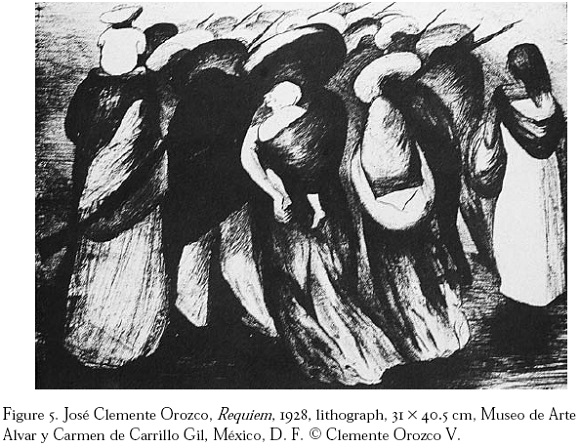 Orozco's reworked Horrores found immediate critical and commercial success, and brought the series out of the darkness. The American Institute of Graphic Arts chose Requiem as one of the best fifty prints of 1928. Walter Pach, who only a year earlier had considered the Horrores heretical, was the juror who helped make the selection. Orozco himself noted that "This lithograph has been a stupendous success, everyone has liked it and the newspapers have spoken very well of it."20 In April 1929 Orozco wrote his wife: "The success continues! The Weyhe Gallery... wants me to make more lithographs. I have only made three. in all the days of my life and they have already given me fame and money."21 In July 1929, Requiem appeared in a group print exhibition at the Metropolitan Museum of Art along with prints by old and modern masters such as Michelangelo, Durer, Rembrandt, Picasso, and Matisse. The critic for the New York Evening Post found Flag and Requiem "dramatic, yet without any forcing of... emotional appeal."22