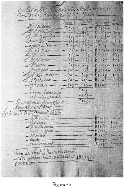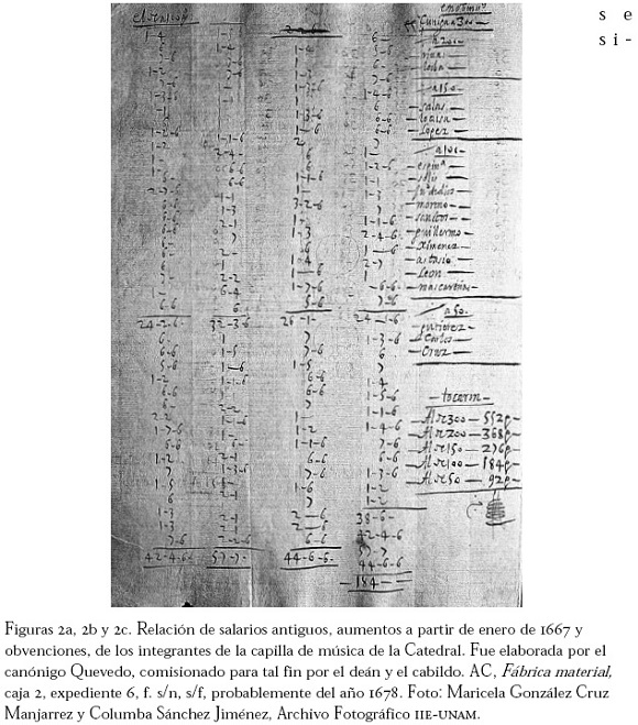 Encontramos una relación muy interesante que reseña los aumentos salariales que recibieron los integrantes de la capilla musical en enero de 1675.5 Aun cuando no especifica las funciones de cada músico dentro de la capilla, sí permite saber el nombre y número de ellos, el sueldo que recibían, el aumento que se les otorgó ese año y lo que recibirían en obvenciones. Como podrá verse posteriormente, éstas jugaban un papel importante en la política salarial de la Catedral.
