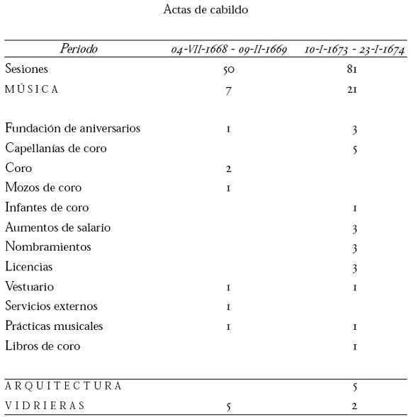 Durante el periodo estudiado, cada acta de cabildo corresponde a una sesión, ordinaria o extraordinaria, de la máxima autoridad catedralicia. Las sesiones extraordinarias no tenían periodicidad establecida; en cuanto a las ordinarias, éstas tenían lugar, en general, dos veces por semana y la mayor parte de los asuntos que ahí se trataban estaban relacionados con aspectos económicos y financieros: diezmos, censos (hipotecas), donaciones, préstamos, pago de réditos y temas relacionados. Los temas jurídicos, políticos, religiosos y administrativos aparecen desde puntos de vista cambiantes y con una frecuencia imprevisible. Entre líneas se aprende a descifrar tensiones, rivalidades, favoritismos e imposiciones. Sin embargo, todos los asuntos reciben un tratamiento verdaderamente sintético y queda constancia de ellos en una especie de taquigrafía conceptual. Todo parece haber sido anotado y poco o nada omitido.4 El siguiente cuadro puede dar una idea de la frecuencia con que fueron tratados temas relacionados con música a lo largo de dos lapsos durante el periodo que se estudiaba y, a manera de comparación, el número de sesiones en las que se trataron temas relacionados con otras artes. El primer lapso corresponde a los primeros seis meses del arzobispado de Enríquez de Rivera y el segundo al último año de vida del maestro de capilla Francisco López Capillas.