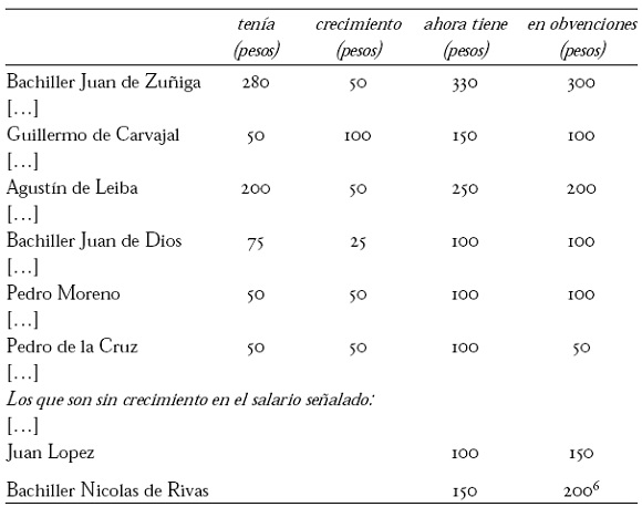 Otro es el caso de Juan López, presbítero, licenciado y ministril de la capilla (no se especifica si cantaba o tocaba algún instrumento), quien no ha de haber tenido ni gracia ni mérito especial puesto que en noviembre de 1669 pide aumento de salario "para poderse sustentar y asistir con la decencia que requiere su estado" y argumenta que tiene mucho tiempo ganando 60 pesos. El cabildo determina que "se le acresciente el salario a cien pesos, inclusos los sesenta con que ha servido hasta el día de hoy [...] Conque no sirva de ejemplar para el susodicho ni otro ministro de la Iglesia".43 Y con esos 100 pesos permanece en la lista de 1675 en el grupo de "aquellos que son sin crecimiento en el salario." Esta actitud aparentemente tacaña y mezquina del cabildo pudiera obedecer a esa falta de mérito especial de Juan López, como no fuera el de su antigüedad.