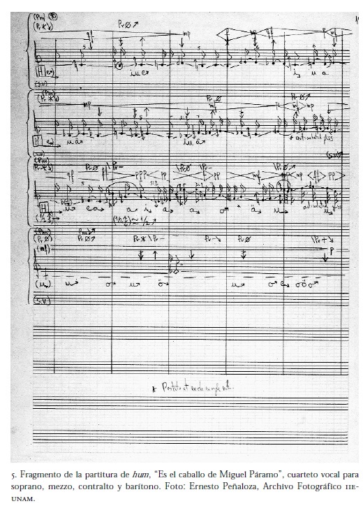 Una muestra esencial de esa dualidad a la que aquí se hace frecuente alusión es evidente a partir de las investigaciones del compositor sobre la obra literaria de Juan Rulfo (1918-1986), creador del "realismo mágico" a través de la novela Pedro Páramo. La ópera de Estrada ejemplifica mejor que ninguna su proceso de investigación-creación con El sonido en Rulfo (Estrada, 1989a), aliado a otros textos que recogen sus búsquedas etnomusicológicas sobre el universo mitológico del prehispánico mexicano (Estrada, 1988a, b, c; 1989b). En la ópera, dentro de una riqueza inédita de su propia concepción del macro-timbre, se encuentran fusionados el realismo mágico de Rulfo y los cantos perdidos del pasado mexicano. Todo contribuye al proceso de imaginación de un inframundo hecho de un espacio y un tiempo duros a la vez que nebulosos. Encontramos este mundo arcaico y profundo en la voz de Doloritas y, más recientemente, en hum, cuya fuerza de expresión está hecha de sonoridades rugosas, ruidosas, desgarradoras y etéreas que dan un sentido trágico a una música que concilia un presagio del futuro y una memoria de lo antiguo (figura 5).