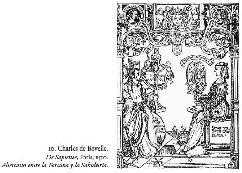 Desde Plutarco se desarrolló la oposición entre lo variable del destino humano, representado por la Fortuna, y la Sabiduría o Prudencia; lucha alegórica que puede verse en la xilografía que ilustra la obra de Charles Bovelle, De Sapiente (figura 10). En el siglo XVI fue muy popular la confrontación entre el vir fortunatus (el hombre que espera instintivamente el momento favorable) y el vir prudens (aquel que somete sus acciones a la razón), cristalizada en el emblema 98 de Alciato, Ars naturam adiuvans (el arte ayuda a la naturaleza; figura 11).12