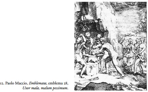 El tema fue retomado por el emblemista Paolo Maccio, quien en el siglo XVII representó a Hefesto trabajando en la fragua, mientras Afrodita danzaba con las ninfas; Maccio identificó a Venus, que perdía el tiempo en vanidades, con el malum pessimun (figura 12).17