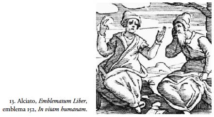 Las reflexiones de Heráclito sobre la vida no pasaron desapercibidas para la emblemática. Alciato las retomó en su emblema 152: In vitam humanam (figura 13), donde se encuentra al desencantado filósofo con otro colega que sostenía una postura diferente frente a la existencia terrena. Demócrito oponía a la queja por los vicios humanos la tranquilidad del ánimo, de allí que Alciato comente: "Llora, Heráclito, ahora más de lo que sueles, las penalidades de la vida humana, pues los males abundan cada vez más en ella. Tú por el contrario, Demócrito, redobla más que antes tus carcajadas, la vida se ha vuelto dichosa". Ver miseria y llorar, o ver actitudes ridículas y reír; debate intenso que se desarrolló en el barroco y llegó a tierras novohispanas por influencia jesuita en 1685, con la publicación del libro Heráclito defendido por el P. Antonio de Vieyra.20