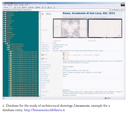 With the objective of scholarly surveying Italian architectural drawings from the 17th and 18th centuries, the Bibliotheca Hertziana (Rome) Max Planck Institute for Art History is setting up a database for research purposes that can be entirely managed and consulted online. The database aims at offering more than conventional catalogues of collections, digital or non-digital, inasmuch as the data on the drawings will be connected with information on individuals and institutions, buildings, projects, archive sources and bibliography. High resolution scanning of the drawings and specific tools for the analysis of images on the computer screen offers new prospects for the study of architectural drawings. The database has the goal of virtually bringing together drawings at present scattered in collections throughout the world; its structure allows research on a complex level and also offers a new, differentiated approach to existing documentary material. The focus is on architectural and art history phenomena such as the creation of architectural drawing collections in the 18th century, the spreading in Europe of individual drawings and buildings utilized as models in academic teaching and in the architectural practice, artistic and professional exchange between architects and patrons, and the development of technical and formal traditions.