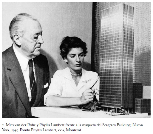 Empero, ¿por qué tanto interés de Bronfman en el fomento de una arquitectura sublime y costosa? De hecho, cuando compró en 1951 el terreno en la Park Avenue, había comisionado a los arquitectos Pereira & Luckmann para desarrollar un diseño representativo de la sede corporativa. Bronfman consultó a su hija Phyllis, quien en aquel tiempo empezó a dedicarse al estudio de la arquitectura, y ella rotundamente rechazó este diseño y propuso a su padre dar la comisión a Mies, un famoso arquitecto del Movimiento Moderno, quien, sin embargo, a la edad de 68 años, en 1954, todavía no había logrado construir un edificio de oficinas (figura 2). Phyllis Bronfman, conocida posteriormente con el apellido de su esposo Lambert, estaba consciente de que Mies, desde sus diseños revolucionarios para rascacielos ficticios de Berlín en los años veinte,2 era el arquitecto adecuado para posicionar la empresa con una signature architecture en la competencia visual de la metrópolis y del mundo. Y, sin duda, el éxito mediático del Seagram Building fue enorme, pues llegó hasta la omnipresencia en la historiografía del arte y a su designación como patrimonio por la Landmarks Preservation Commission de la ciudad de Nueva York, en 1989.3