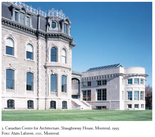 Al terminar esa década, funda, por su propia iniciativa privada y gracias al fondo millonario familiar, el Canadian Centre for Architecture (CCA), dedicado a la documentación, colección y exposición de la arquitectura a nivel internacional (figura 3). Diez años después, el centro ocupó las nuevas y muy amplias instalaciones de la antigua Shaughnessy House, la mansión neoclásica de William Tutin Thomas, de 1874, restaurada por Denis Saint-Louis y ampliada con una nueva parte diseñada en critical classicism por el arquitecto Peter Rose en colaboración con Eric Marosi, Nicholas Garrison y Erol Argun; además, se anexó un jardín para esculturas, diseñado por Melvin Charney, que se expande en parte sobre una autopista cubierta, recuperando así un espacio perdido de la automovilidad. Todas estas remodelaciones y re-vitalizaciones están bien documentadas en un catálogo de alta calidad en cuanto a contenido y presentación gráfica4 lo que, sin duda, se espera de un centro de arquitectura y fueron expuestos en la Bienal de Arquitectura de Venecia en 1989. De hecho, como explica el arquitecto Peter Rose, la construcción del CCA, donde Phyllis Lambert firma como cliente y consulting architect, hizo de él un elemento integral a la formación de la institución, no sólo su contenedor neutral.