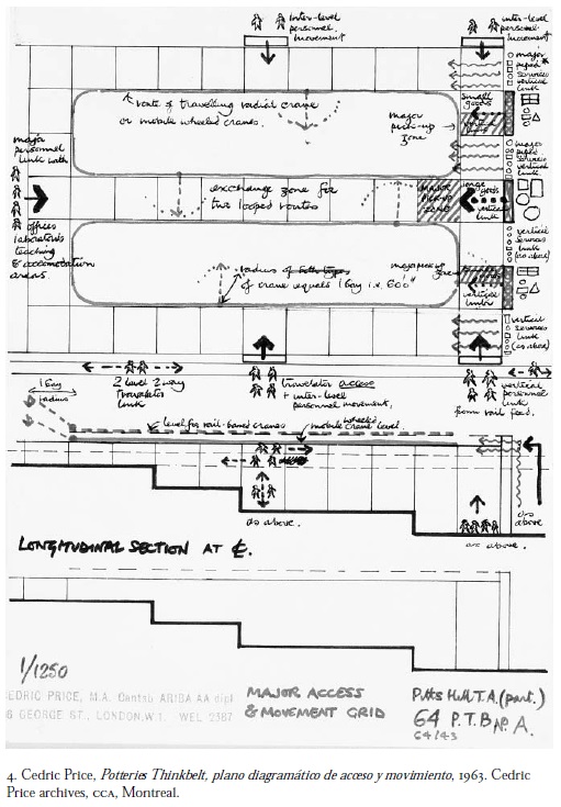 Price, en 1963 (figura 4) planeaba en un acto de autocomisión y autonomía un megaproyecto educativo con parámetros que tienen vigencia hasta hoy: su utopía concreta del Potteries Thinkbelt en North Staffordshire, Reino Unido, esbozó la transformación de un paisaje industrial en plena decadencia en un paisaje intelectual con una universidad técnica, un "cinturón de razonamiento" (thinkbelt) para veinte mil estudiantes. Contrastante con la estrategia estatal de establecer universidades centralizadas en un campus, Price propuso una universidad descentralizada, cuyos institutos, aulas, comedores y hogares estudantiles se destribuyeran a lo largo de la red ferroviaria existente en esta zona industrial, llegando al extremo de unidades móviles para la impartición de clases sobre rieles. Más allá del carácter utópico del proyecto, que se explica por el entonces culto a la movilidad arquitectónica como por ejemplo la Walking City o la Plug-In-City de Archigram,9 la idea de revitalizar la "basura" disfuncional de la industrialización con nuevos usos tiene mayor vigencia que nunca.10