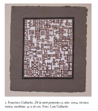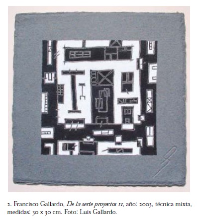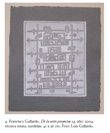 Al que escribe estas líneas le tiene sin cuidado y supongo que también le despreocupa a Gallardo que la soltura, virtuosismo y oficio capaz con que el artista manipula sus creaciones tenga una simpatía, en concepto o en actitud, con el trabajo de los grandes artesanos "tradicionales". La imperante suspicacia en torno a la habilidad o la manualidad en el contexto del arte contemporáneo es un prejuicio, ya casi centenario, que no tolera un sencillo ejercicio de análisis, al tiempo que la segmentación de la creación contemporánea entre artistas y artesanos, y entre tradición e innovación, entre original y copia, denota un clasismo intelectual, un "formalismo" conceptual, que estorba para vincular, de manera distinta a la de la especialización académica, al arte contemporáneo y a su exégesis con otras áreas del pensamiento y de la práctica creativa. Una de esas maneras distintas de aproximación y vinculación, en el caso de la obra de Gallardo, la encuentro entre una parte importante de su producción y los sistemas de representación gráfica arquitectónica, no refiriéndome específicamente al dibujo técnico utilitario cuyas convenciones generales se establecen a partir del siglo XVI, sino también a los trazos arquitectónicos y urbanos con que artistas, maestros de obras y legos han representado los edificios, los trazos urbanos y las cartografías desde hace, por lo menos, 2 500 años. En muchas de las mencionadas obras de papel de Gallardo, la mirada identifica, de manera casi inmediata, contornos arquitectónicos, vías, bordes, barrios y señales urbanas, sin que esta identificación implique que el artista haya recurrido necesariamente a convenciones simbólicas o de representación específicas; aun evadiendo referencias urbanas tan concretas, el que mira reconoce en el diseño del papel más que un simple trazo geométrico una construcción: una serie de elementos que, por medio de un proceso determinado, se articulan en un sistema. Esta construcción, por supuesto, depende de la memoria, de las referencias y las preferencias del que percibe, y el versado en términos de representación arquitectónica reconocerá en la obra de Gallardo lo que le conviene; pero el reconocimiento en ésta de sistemas topográficos, o de esquemas constructivos, es una actitud compartida por muchos que la han mirado. Este conjunto creativo es evidentemente un producto de su tiempo, más allá de que algunos pretendan calificarlo de "anticuado" o "anacrónico" con respecto a las tendencias estéticas vigentes. Y, reflexionando, imputarle los valores de lo anacrónico interpretando este calificativo como aquello que está fuera de lo que concierne al tiempo no perjudica en absoluto el interés que genera: posiblemente una gran cualidad de la producción de Gallardo reside en su capacidad de referirnos o evocarnos órdenes de composición que han sido ejercidos o imaginados en distintos lugares y en distintas épocas, órdenes que derivan de la abstracción tanto de procesos identificados en la naturaleza como de los medios con los que los humanos construimos e interpretamos nuestros espacios; órdenes que consisten en identificar, en las cosas que existen y en las que se imaginan, un principio elemental de naturaleza numérica, matemática y geométrica que se desarrolla hasta niveles complejos, pudiéndose reconocer, a pesar de la complejidad formal que se alcance, la matriz original.