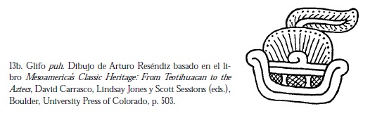 Puh, la forma maya de ese signo según el mismo autor, tanto en la iconografía como en la escritura jeroglífica se parece visualmente al día Caña del calendario mexica.