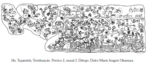 Invito ahora al lector a realizar un viaje en el tiempo y el espacio hasta la antigua Teotihuacán, para analizar los murales de Tepantitla, que fueron realizados alrededor del 450 d.C., unos cuatro siglos antes de que se pintaran los de Bonampak (figura 8).