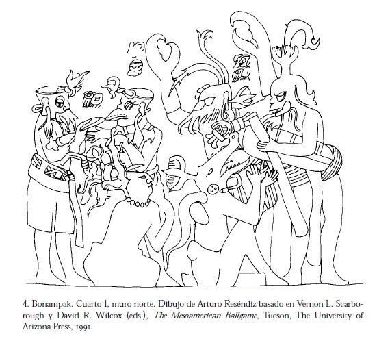 Volvamos a Bonampak. Como he demostrado, las escenas del cuarto número 1 muestran los rituales celebrados por la nobleza en una importante fecha histórica y de calendario. Ellos realizan autosacrificio, adivinación, danzas y cantos que reactivan los mitos de creación.