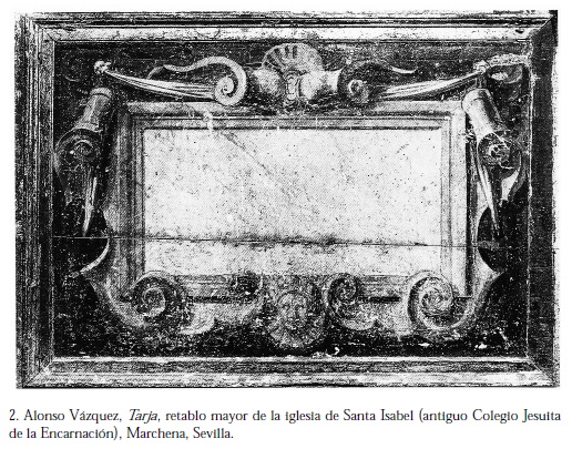 El paisaje se concreta en "veinte y ocho tarjas de lejos", cuya temática ignoramos. ¿Atlas ilustrado de cordilleras, montes y cerros, en alusión a su apellido Montesclaros o "claros montes", como poéticamente es invocado en las composiciones panegíricas que le dedican los literatos contemporáneos? ¿Vistas de pueblos y ciudades, dada la afición del virrey por impulsar las relaciones topográficas, apoyar los trabajos geográficos y elaborar padrones de los territorios que gobernó? ¿Escenas religiosas o mitológicas con personajes diminutos en primer plano, árboles y peñas situados detrás, y fondos "donde se junta la sierra con el cielo", según postula el rigorista Pacheco42 a propósito de la representación canónica del género? Algunos debieron de obedecer a esta última iconografía, pues Vázquez poseía en su aposento del jacal de las Casas Reales, de México, "tres lienços de lejos, guarneçidos, de mano de un pintor que se desia Martin, estranjero". Obviamente, al "martin estranjero" hay que identificarlo con el flamenco Martín de Vos que, durante su aprendizaje en el taller veneciano del Tintoretto, se especializó en la pintura de paisajes colaborando en las obras de su maestro.43 Los "paises" independientes de Vos, que fueron muy apreciados en España hasta el punto de figurar en los inventarios reales del Alcázar de Madrid,44 se caracterizaban por recrear grandes escenarios donde la naturaleza empequeñece a la figura humana45 y, puestos a especular, es posible que el diseño arquitectónico de las tarjas se aproximara a las cartelas que exornan el retablo pintado por Vázquez para el colegio jesuita de Marchena.