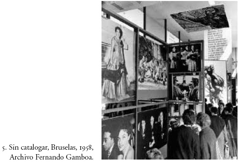 Atrapado entre la diferenciación estética y la toma de decisiones políticas, Gamboa parece preocupado por el impacto social de lo que él y sus exposiciones proponen en el extranjero como representativo de la realidad mexicana. La preocupación sociologizante sobre la imagen y su referente se agudiza con la cercanía de Gisèle Freund. Considero que es la alemana quien sugiere el uso extensivo de la fotografía para documentar la vida diaria de aquel universo que las obras de arte refieren. Coincide también 1952 y la estancia de Gamboa en París con un cambio radical en la cantidad y calidad de las fotografías empleadas. El argumento expuesto por Freund es simple: desde su invención en el siglo XIX, y tras su popularización en el siglo XX, la fotografía estaba tan directamente relacionada con la vida diaria y era tan aceptada, más allá de cualquier barrera socioeconómica, que no hay modo ya de separar la práctica de su representación. Es decir, la visión de quienes fotografían y el potencial político de la lectura de aquellas imágenes, en su contexto y después como documentos históricos, son incontestables.32 En 1946 Gamboa monta la Exposición Etnográfica donde todo había sido documentado desde la fotografía. Miguel Covarrubias actuó entonces como uno de sus asesores. La fotografía sólo acompañaba a las muestras de arte entre 1950 y 1953, pero en la Exposición Universal de Bruselas en 1958 la fotografía es ya un género aparte y su lugar en el pabellón mexicano resulta indiscutible (fig. 5).33