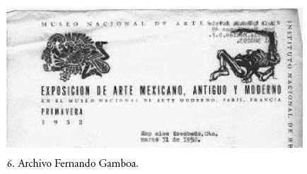 Otro rasgo en común de ambas exhibiciones, la de Covarrubias en 1940 y la de Gamboa entre 1950 y 1953, es que una y otra cumplían funciones diplomáticas. No sólo fueron presupuestadas y promovidas por el Estado mexicano, que veía con buenos ojos la mexicanidad representada, la nación sobre la que su gobierno se legitima, sino que eran un imperativo en el ámbito panamericano. Fue la Secretaría de Relaciones Exteriores la que canalizó recursos hacia las muestras, sirviendo además como nexo institucional entre los involucrados y las entidades extranjeras pertinentes. La cancillería mexicana debía aprobar previamente todo cuanto Gamboa propusiera. El catálogo de la exposición que primero viajó a Estocolmo, luego a París y finalmente a Londres habla del "orgullo consciente de un pueblo, esfuerzo por revelar un origen antiguo y exponer nuestra vida espiritual".8 El arte era considerado entonces como un "valor espiritual" y suponía una circunstancia común a toda la humanidad, que podía ser ilustrada por sus logros en la plástica y su patrimonio cultural. Es decir, una vez que los objetos mostrados por una nación a las otras son aceptados y aclamados como de naturaleza artística, son ungidos en el museo y reconocidos universalmente dada esa misma virtud intrínseca que parecen tener. Los países han logrado así elevarse al mismo status y entablar un diálogo civilizado.9