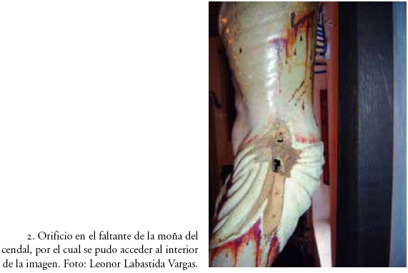 21.Esta cola se identifica gracias a los restos que quedan en el interior de la obra, con la tradicional cola animal usada comúnmente en la imaginería española, la cual también ha sido descrita en las imágenes del siglo XVI a las que aludíamos anteriormente al hablar de su sistema de realización.